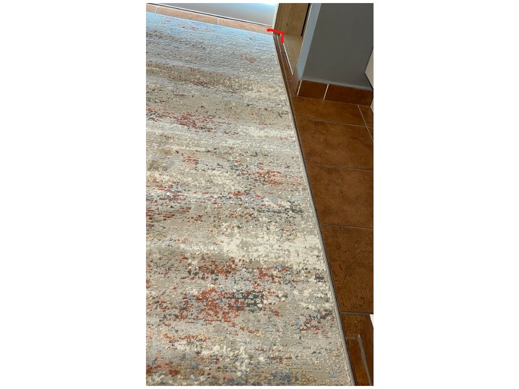 Koberec s vadou z výroby. Jedna strana není kolmá, ale zešikmená. Fotky vady jsou umístěny v galerii za úvodní fotkou.