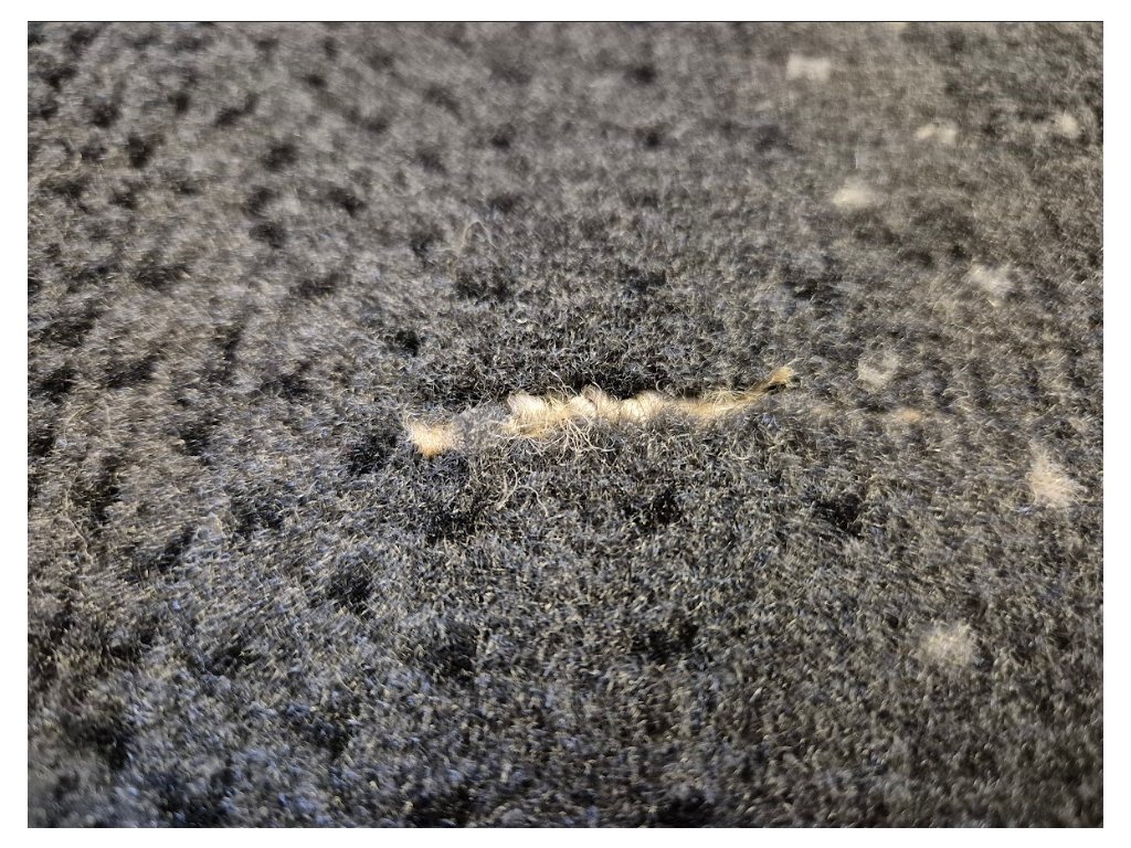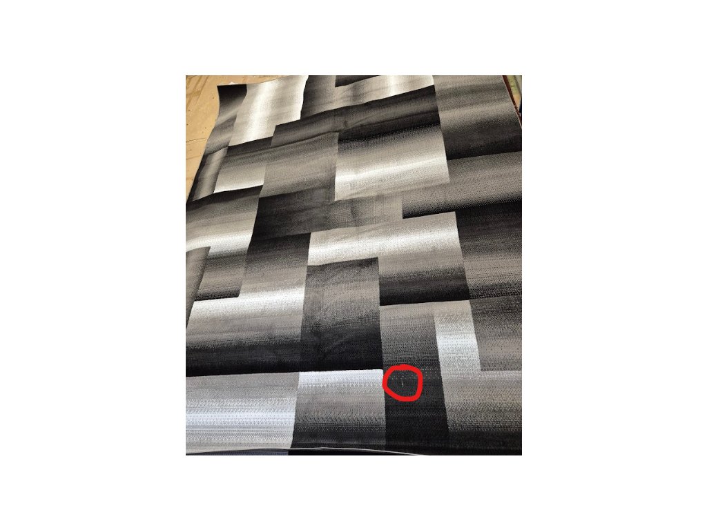 Koberec s chybou v barvě prošití z výroby. Barevná chyba v rozsahu 5 cm. Fotografie vady v galerii hned za úvodní fotkou.