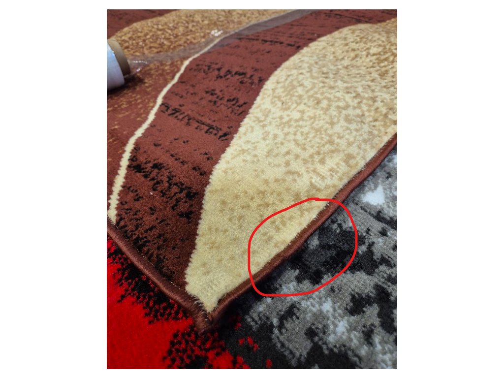 Poškozený koberec s vadou během přepravy. Poškozený roh a část lemu v rozsahu 4 cm. Fotografie poškození jsou umístěny v galerii za úvodní fotkou.