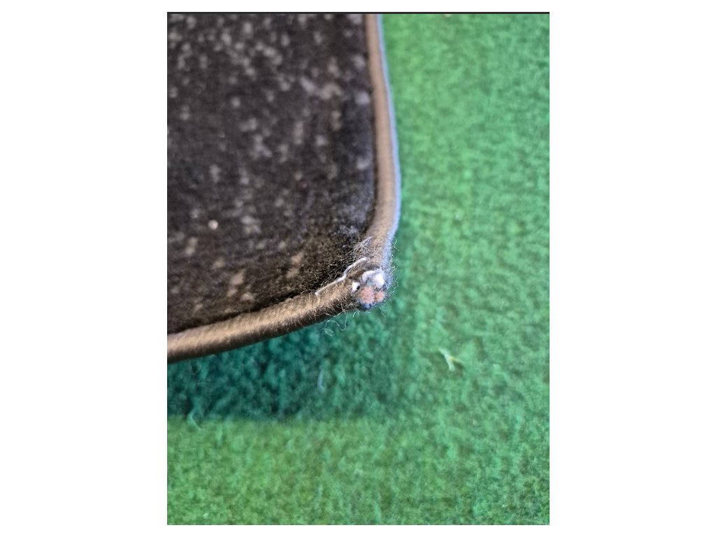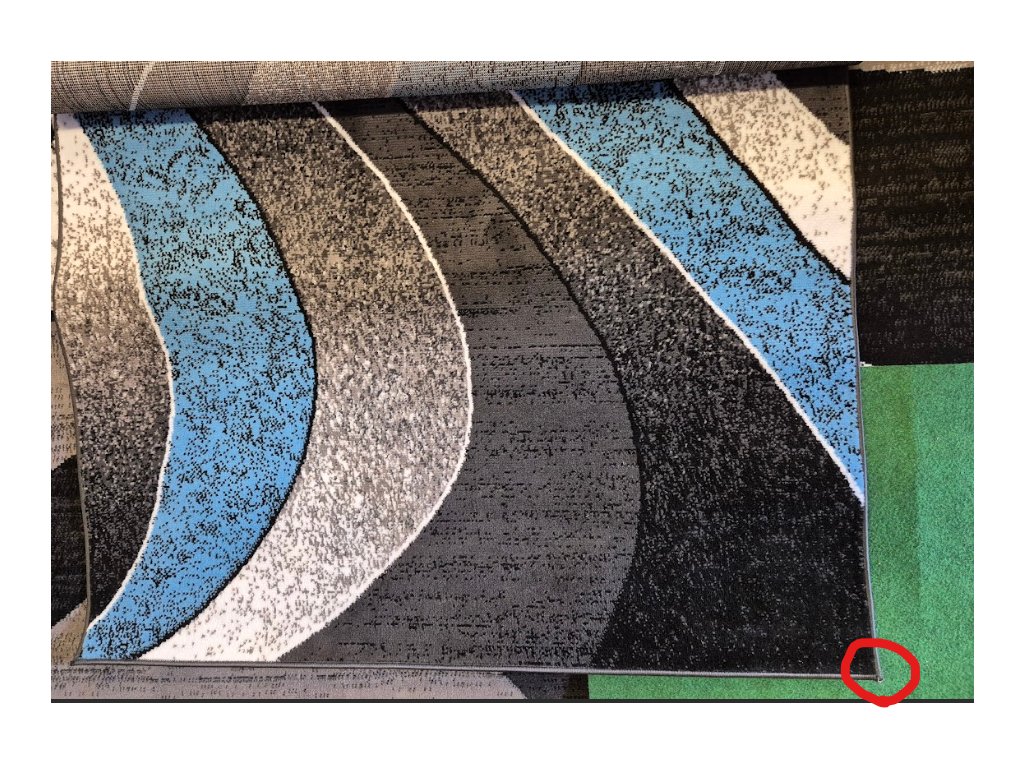 Poškozený koberec s vadou z přepravy. Poškozený okrajový lem v rohu koberce. Fotografie poškození v galerii.