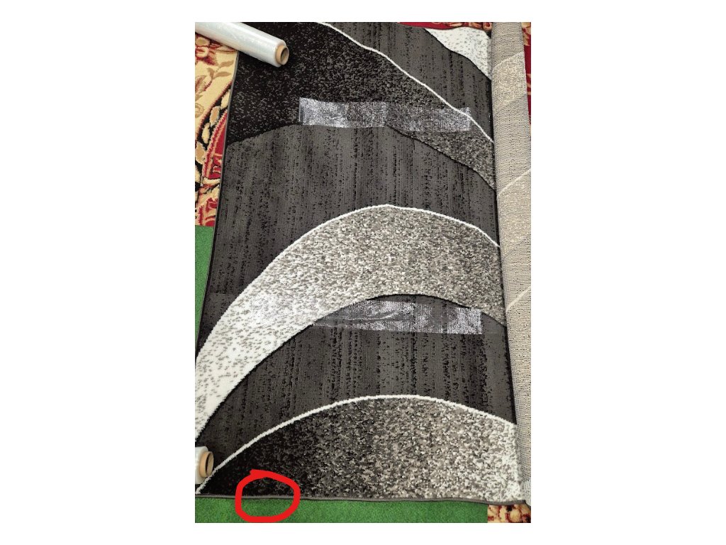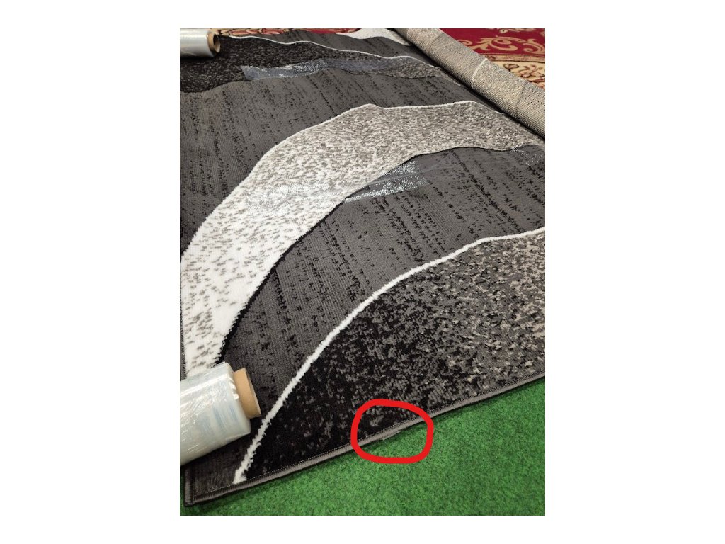 Poškozený koberec s vadou z přepravy. Poškozený okrajový lem (rozsah 2,5 cm). Fotografie poškození v galerii za úvodní fotkou.