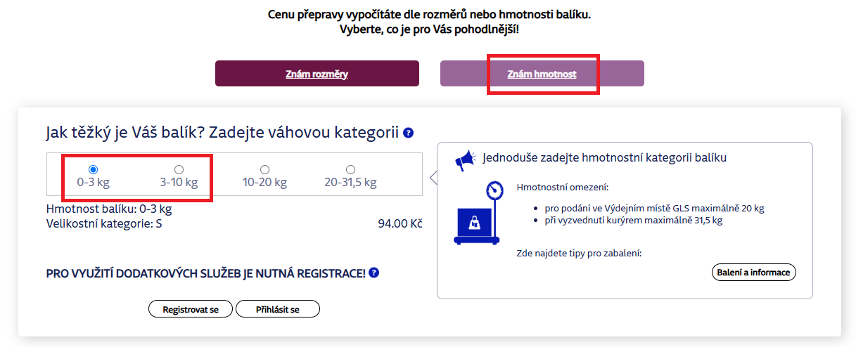 - Kurýr GLS (resp. www.e-balik.cz), (za příplatek lze vyzvednout přímo na vaší adrese), (balíky s maximální délkou 200 cm), (vyplňujte dle hmotnosti ne dle rozměrů, viz obrázek níže; váha stačí odhadem, obvykle ne více než 10 kg)